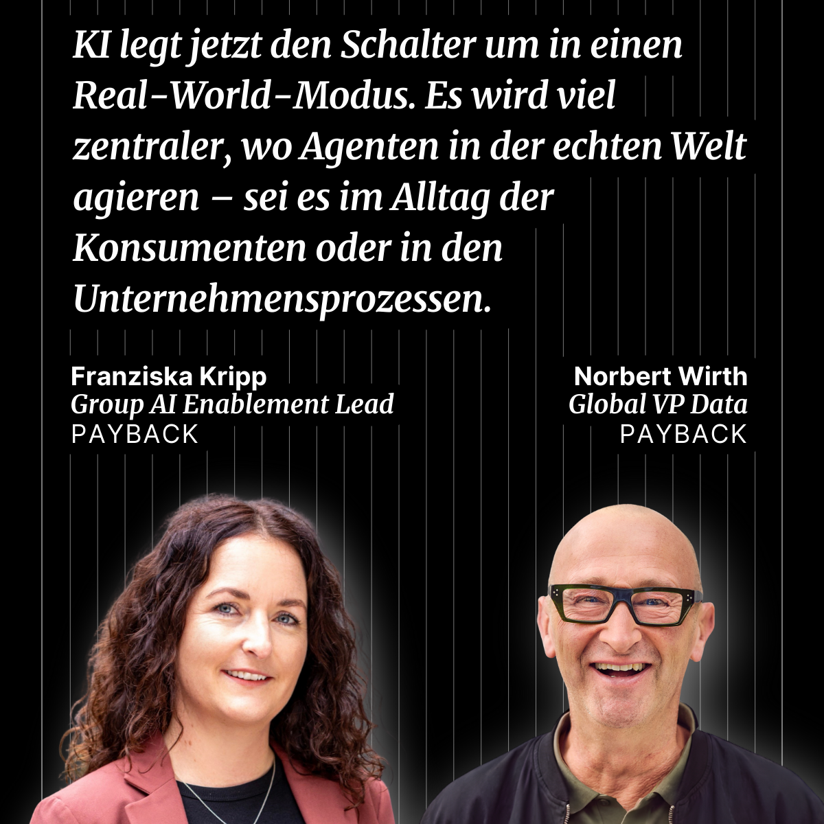 Im aktuellen AI-First-Podcast mit Felix Schlenther durften Franziska Kripp (Group AI Enablement Lead) und Norbert Wirth (Global VP Data) erzählen, wie wir bei PAYBACK AI Schritt für Schritt in unsere DNA integriert haben: